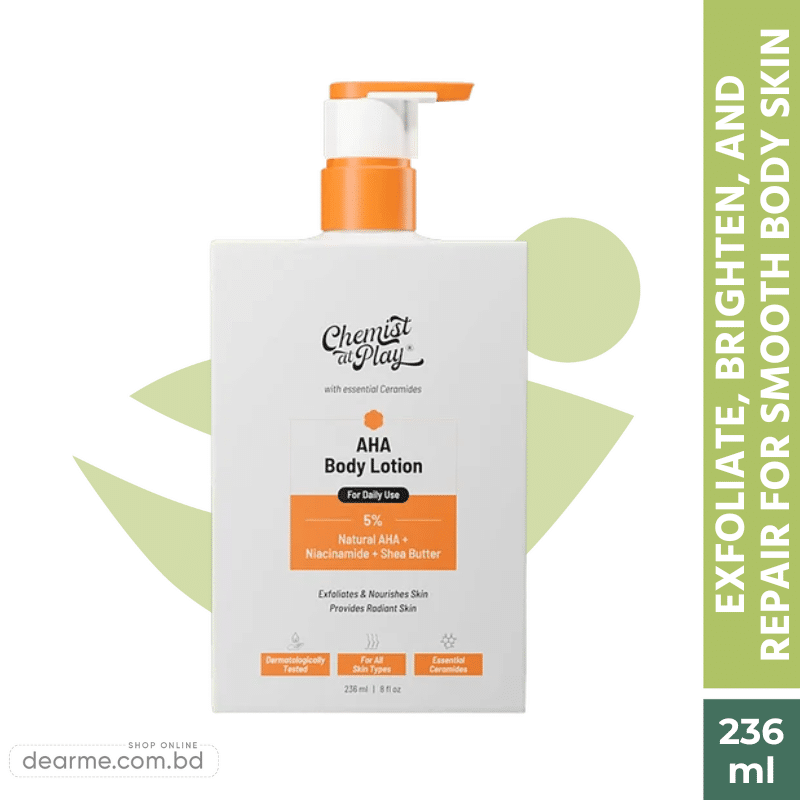 Tired of dull, rough, or pigmented body skin? The Chemist At Play AHA Body Lotion is your all-in-one solution for achieving body skin that is exceptionally soft, smooth, and radiant. This daily body lotion features a powerful combination of 5% Natural AHAs for gentle chemical exfoliation and Essential Ceramides for deep barrier repair.